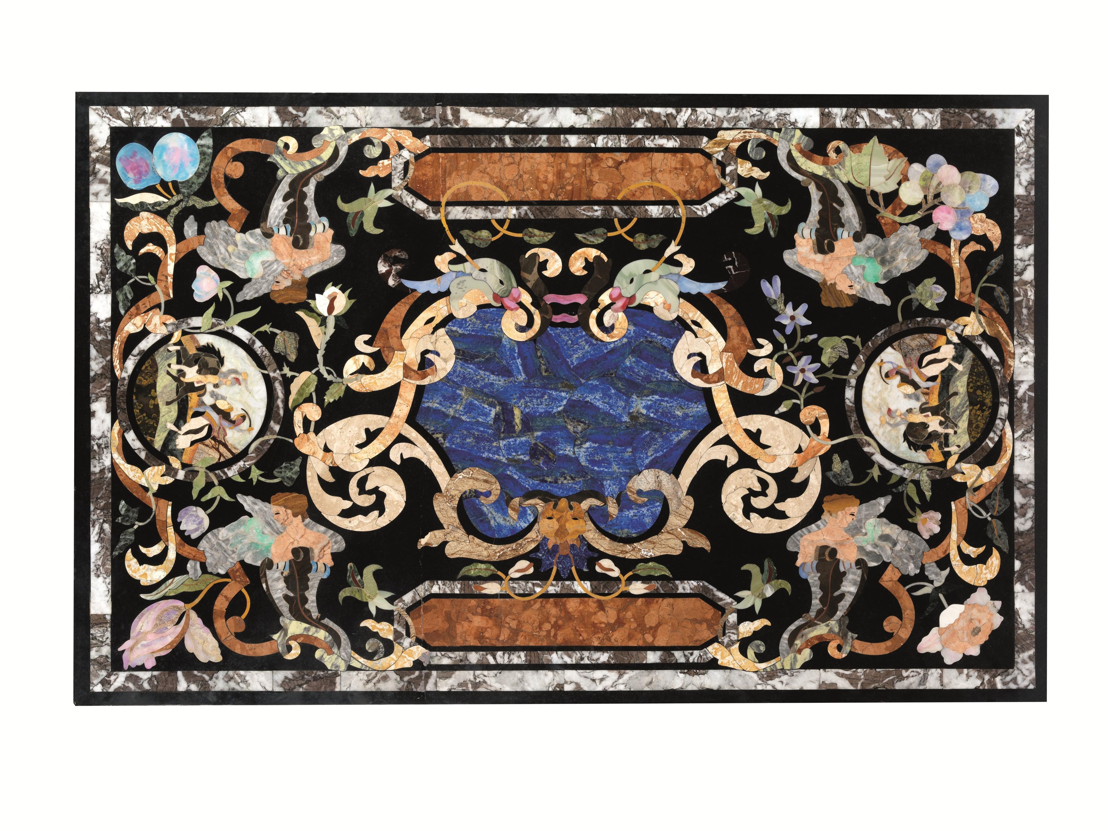 Piano di tavolo, sec. XIX, in commesso di pietre dure, decorato da grandi volute, fiori e frutta e tondi con scene di combattimento tra cavalieri, cm 118x75, ricomposto da due frammenti