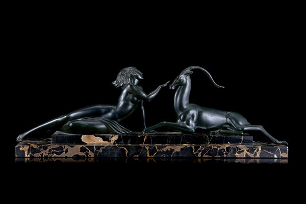 Scultura di gusto déco in fusione di lega metallica patinata verde raffigurante una donna distesa di fronte ad una antilope, poggiante su base in marmo nero venato. Francia, secolo XX. Firmata Fayral e recante marchio di fonderia Le Verrier Paris (cm 65x25x15) (lievi difetti)