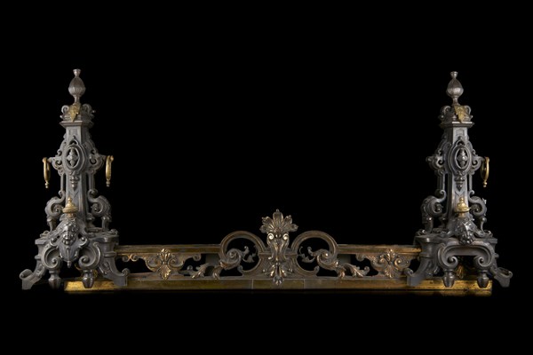Ringhiera da camino in bronzo dorato e brunito decorato nei montanti a fregi, anelli e mascheroni e nella fascia a volute fogliate e traforate. Secolo XIX (L. cm 110; h. cm 45) (difetti e mancanze)