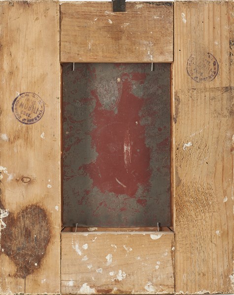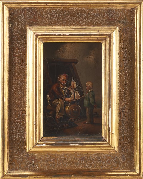 Unknown artist of the 19th century "Sailor and child" oil on sheet metal (cm 21,5x14) On frame on the back: stamps. In gilded wooden frame (defects)