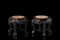 Coppia di basi portavaso con piano tondo in marmo, fascia traforata, gambe sagomate ed intagliate con piedi terminanti ad artigli che reggono sfera. Cina, secolo XX (cm 58x47) (lievi difetti)