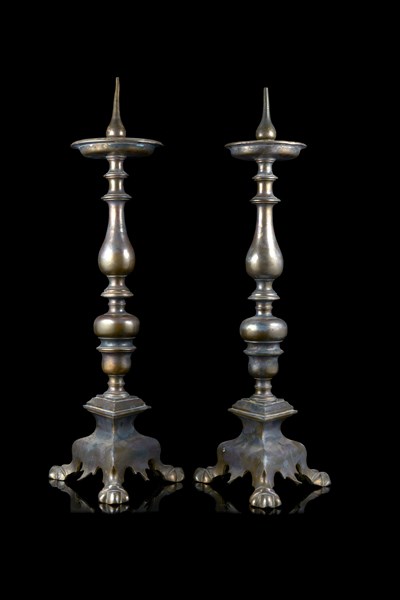 Coppia di portaceri a rocchetto in bronzo con piedi a zampa ferina stilizzata. Secolo XVIII (h. cm 63) (lievi difetti)