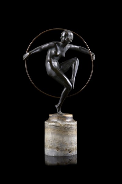 "Danzatrice con cerchio" Scultura Art déco in bronzo patinato su base in onice
