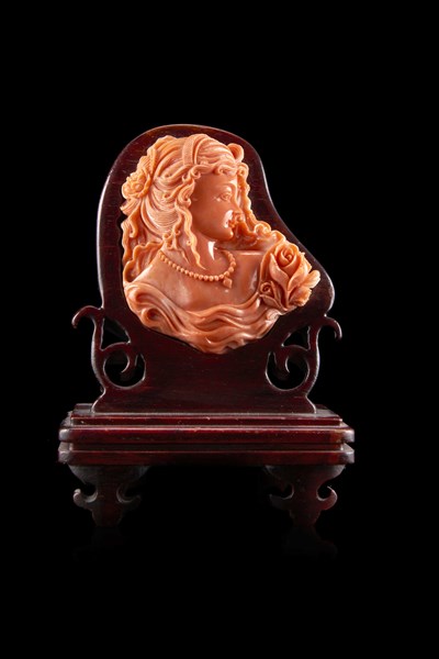 Art of the 20th century "Profile of woman with flowers" coral high relief (cm 9x6,5) mounted on oriental-style base