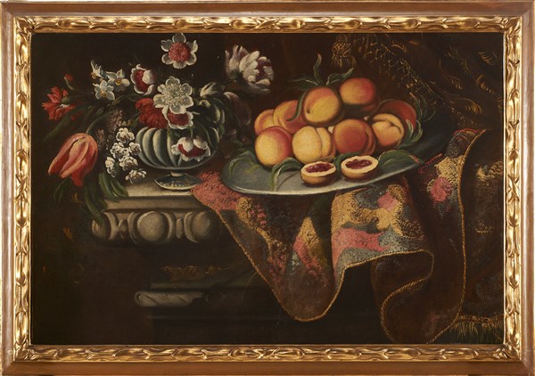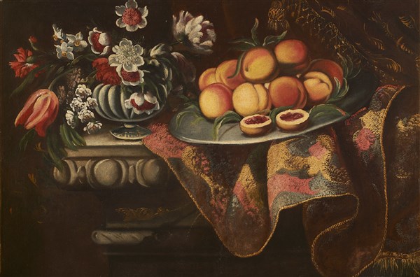 Composizione con pesche, vaso fiorito e drappeggio