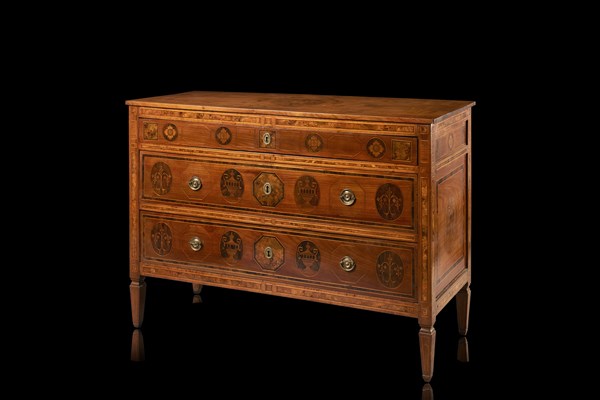 A late 18th-century Emilian walnut and various woods veneered, inlaid and threaded commode with geometric, floral and vases motifs (cm 129x93x53,5)