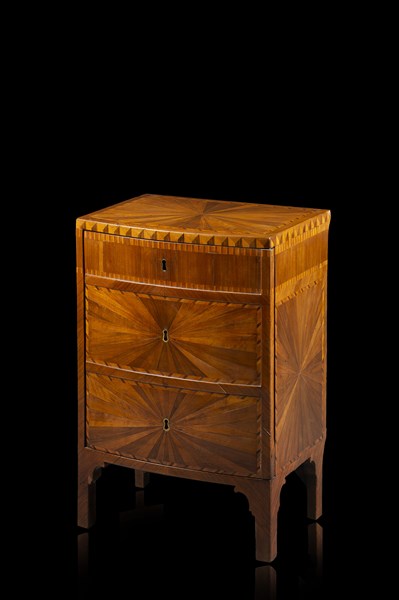 Comoda lastronata, filettata e intarsiata in legni vari a motivi geometrici. Fronte a un'anta a tre finti cassetti, piedi squadrati. Secolo XVIII (cm 48x73x37) (difetti)