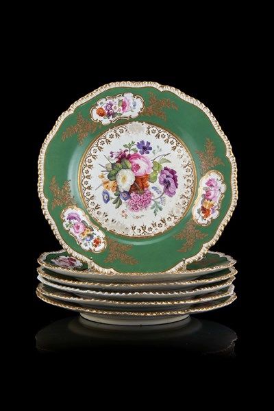 Manifattura francese, secolo XIX. Gruppo di sei piatti in porcellana a bordo mi