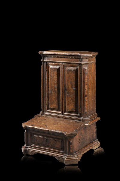 Inginocchiatoio in noce con piano sagomato, fronte a due ante con pannelli e montanti radicati. Base apribile, piedi squadrati. Secolo XVII (cm 52x80x47) (lievi difetti)