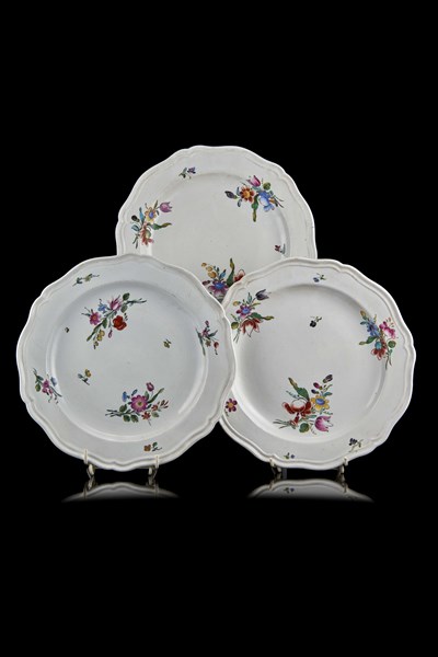 Manifattura di Ginori, secolo XVIII. Gruppo di tre piatti in porcellana decorat