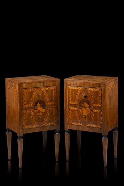 Coppia di comodini lastronati, filettati e intarsiati in legni vari. Fronte a due cassetti centrati da cartella con figure classiche, profili decorati a foglie e ghiande. Piedi a obelisco rovesciato. Fine secolo XVIII (cm 46x84x34) (difetti e restauri)