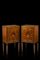 Coppia di comodini lastronati, filettati e intarsiati in legni vari. Fronte a d