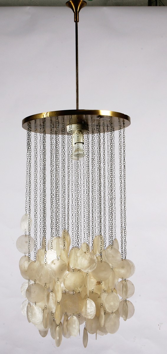 PANTON VERNER (1926 - 1998). Lampadario con elementi in madreperla sorretti da catenelle in ottone. Chandelier with mother of pearl's elements, supported by brass chains Madreperla e ottone. Cm 44x135. 1960.