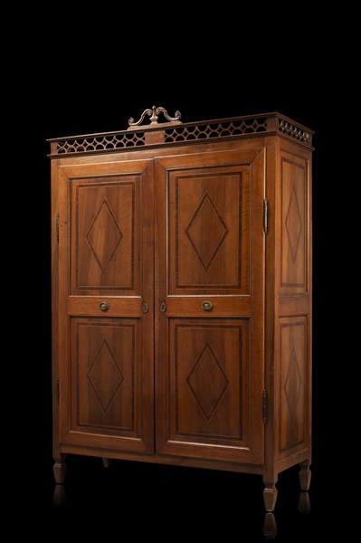 Armadio in noce filettato a due ante pannellate con cimasa traforata. Fine secolo XVIII (cm 142x212x46) (difetti)