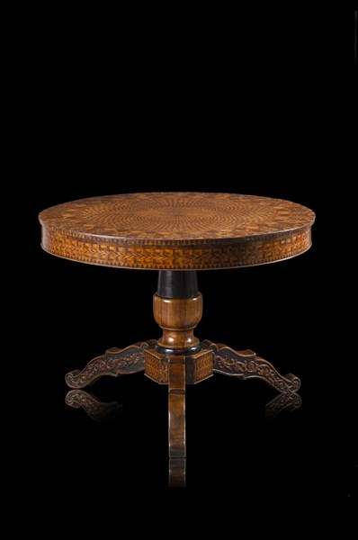 Tavolo di forma tonda interamente lastronato ed intarsiato in legni vari ed osso a motivi geometrici. Gamba centrale tornita, terminante a tre piedi sagomati, intagliati a rami fioriti. Secolo XIX (d. cm 110; h. cm 78) (difetti)