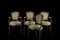 Gruppo di quattro poltroncine in noce con schienale a scudo, braccioli e montanti mossi e scanalati, gambe tornite decorate da rosoni all'attacco. Secolo XVIII (lievi difetti)