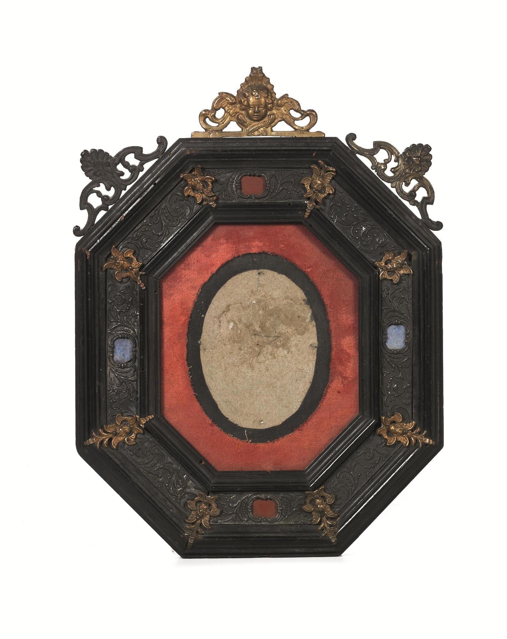 Cornice, Firenze, metà sec. XIX, di forma ottagonale in legno ebanizzato e bronzo inciso, piccole applicazioni in metallo dorato modellate come cherubini a cui si alternano medaglioni in pietre dure, cm 31,5x24