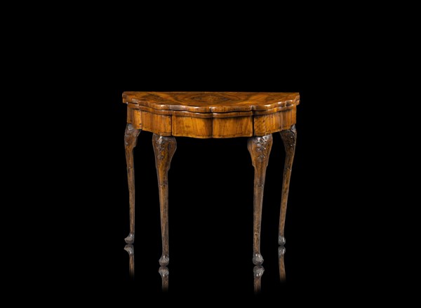 Tavolo da gioco lastronato in noce e radica, filettato in legno chiaro con piano di forma sagomata. Fascia con cassetto, gambe intagliate all'attacco terminanti a zampe stilizzate. Veneto, secolo XVIII (cm 92x75x44) (difetti e mancanze)