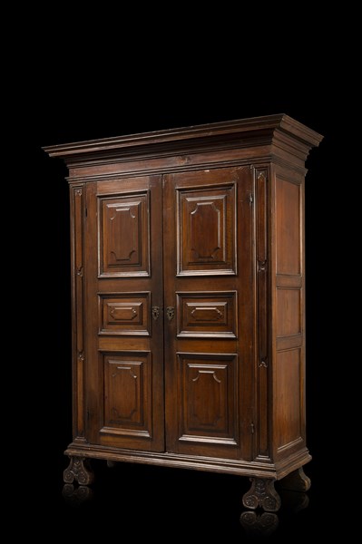 Armadio a due ante in noce con fronte, fianchi e montanti pannellati e riquadrati, piedi intagliati a volute. Piacenza, secolo XVII (cm 160x210x67) (difetti)