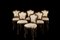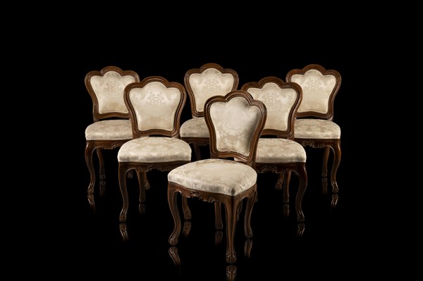 Gruppo di sei seggioline in noce con schienali sagomati e fasce intagliate a motivi vegetali, gambe mosse terminanti a zampe che sorreggono la sfera. Emilia, secolo XVIII (difetti)
