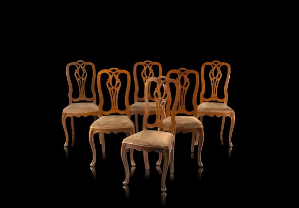 Gruppo di sei sedie con schienale alto decorato a listelli e a volute, gambe anteriori mosse e posteriori a sciabola. Centro Italia, secolo XVIII (difetti)