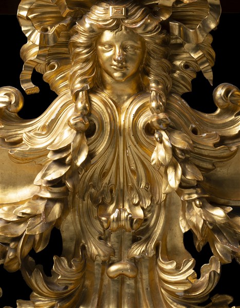 Grande console di forma sagomata in legno intagliato e dorato a mascherone, vol