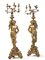 Coppia di sculture reggitorcia, Venezia, fine sec. XVIII, in legno scolpito e dorato, modellate come due figure maschili nude con panneggio ricadente dalla spalla al bacino, un braccio alzato e la gamba contrapposta avanzata, poggianti su base circolare con tre piedi a voluta e sormontati da tralcio di pampini con cinque portacandele ciascuno, alt. cm 154, piccoli danni consunzioni e ridorature (2)