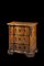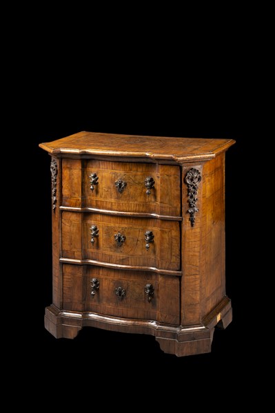 Comodino con piano di forma sagomata e fronte mosso a tre cassetti in noce e radica filettati in legno chiaro, montanti decorati da fregi, volute e foglie. Emilia, secolo XVIII (cm 75x79x46) (difetti)