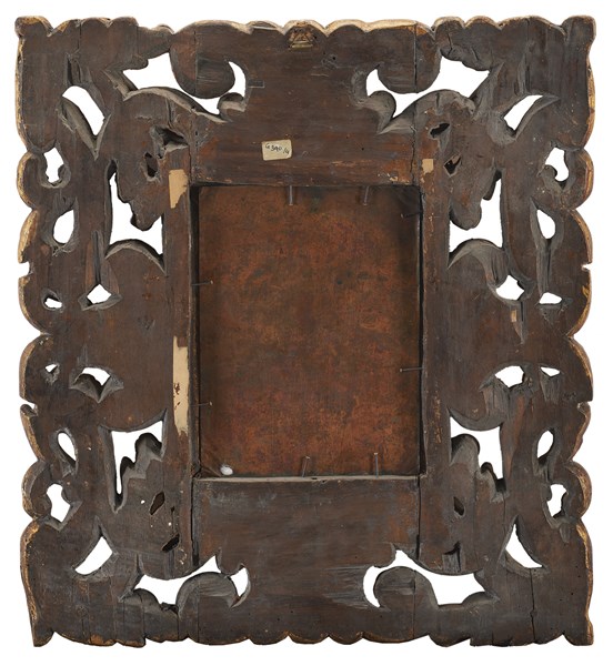 antique wooden ornament carved, pierced and redecorated with scrolls and leaves (defects and restorations)