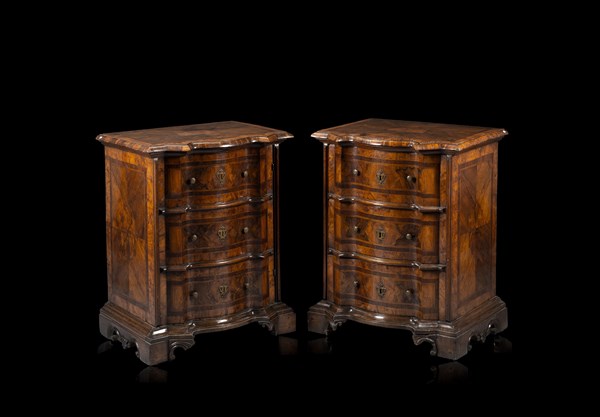 Coppia di mobiletti lastronati in noce e legni vari, con fronte, fianchi e cope