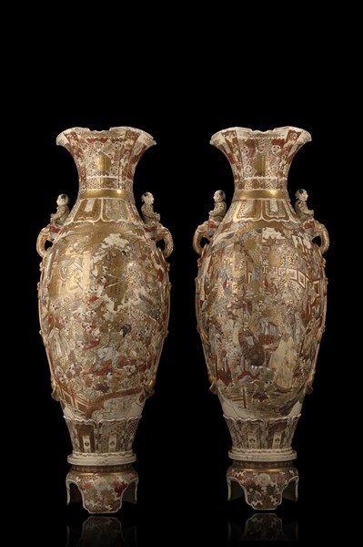 Coppia di grandi vasi biansati in porcellana Satsuma interamente decorati in po