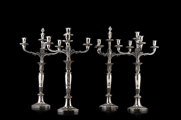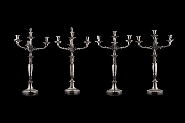 Gruppo di quattro candelabri in argento a quattro fiamme con reggicandela scana