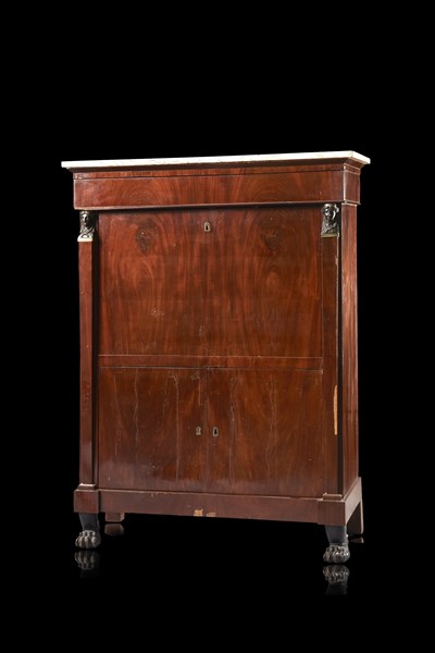 Secrétaire con fronte a un cassetto, due ante e ribalta celante scarabattolo architettonico con cassettini, segreti e vani. Montanti a erme con teste in bronzo. Piedi ferini, piano in marmo. Inizio secolo XIX (cm 101x140x45) (difetti)