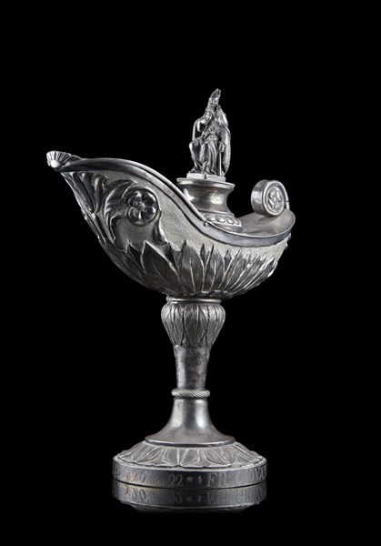 Navicella in argento sbalzato e cesellato a foglie d'acanto e volute. Sormontata da figura di vescovo a tutto tondo ed iscritta alla base "FR GIOVANNI BIAGIOLINI DONO' L'ANNO 1842 P. 26 den 22" Bologna, secolo XIX. Argentiere Giovanni Zanetti (h. cm 22) (g 700) (difetti)