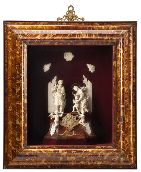 Sicilian art, early 19th century "St. John, St. Zechariah, St. Elizabeth and two angels" ivory composition on breccia base with mother-of-pearl carved and pierced friezes. In tortoise-shell veneered case frame (cm 40,5x44,5) (defects)