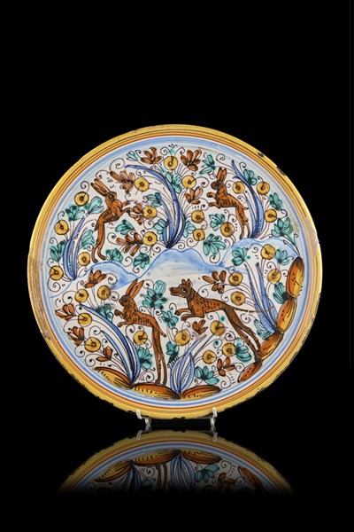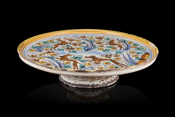 Manifattura spagnola, Talavera de la Reina, fine secolo XVII. Alzata in maiolica policroma decorata da lepri e cane tra girali di foglie e fiori (d. cm 31,5; h cm 7,5) (difetti e restauri)