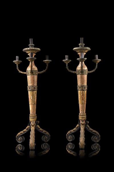 Pair of late 18th-century large lacquered wooden and gilded wrought iron torch holders (h. cm 205) (defects)
