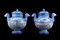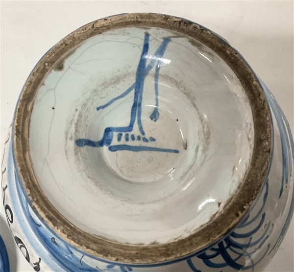 Manifattura di Albissola, inizio secolo XVIII. Bottega della famiglia Levantino. Coppia di stagnoni da farmacia con coperchio in maiolica bianca e blu, decorati a paesaggio e iscritti: "Mel:Rose" e "Fenoglietta" (h. cm 21) (difetti)