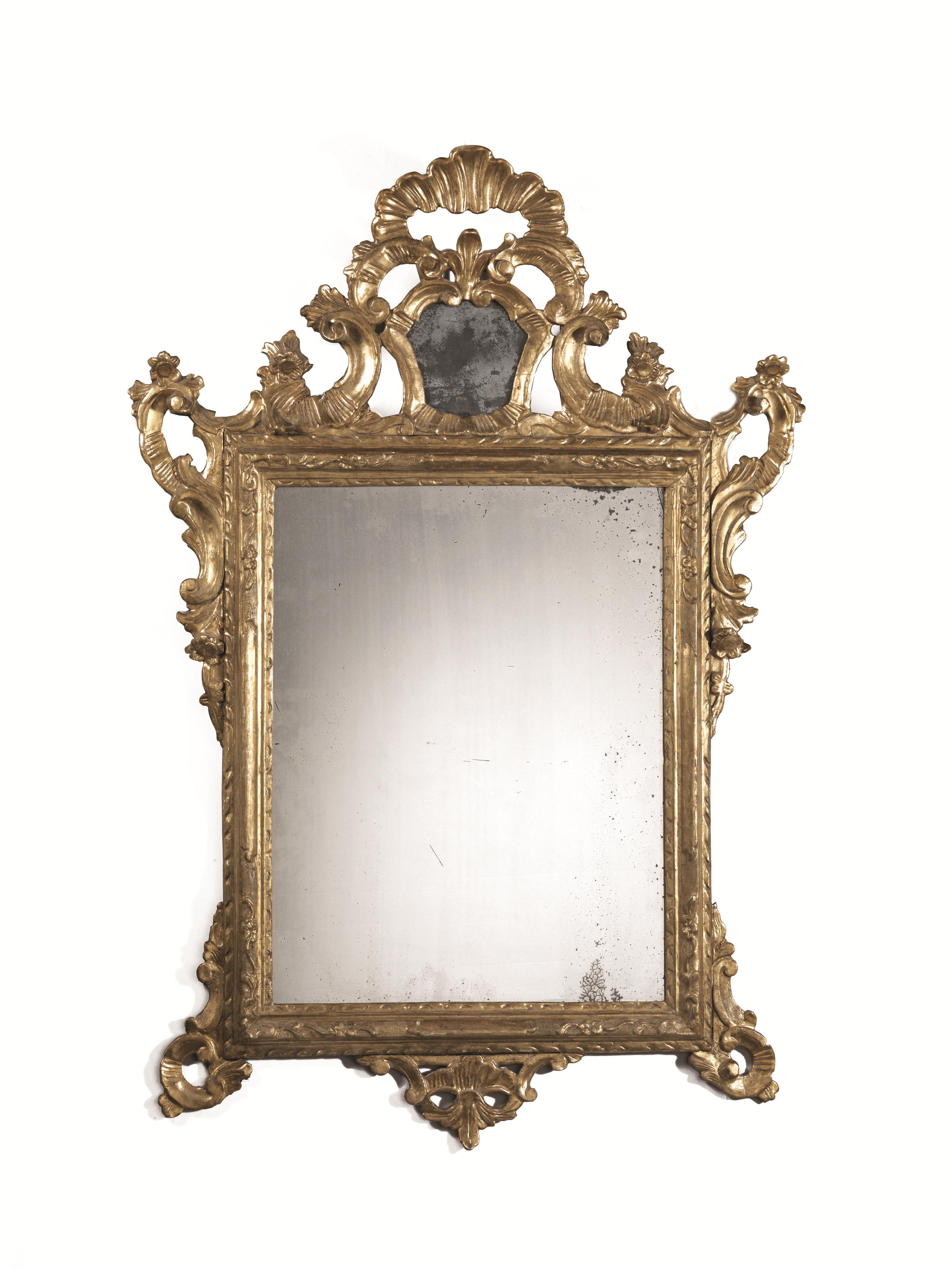 Specchiera, Veneto, seconda metà sec. XVIII, in legno intagliato e dorato, cimasa sormontata da conchiglia di gusto rocaille, con volute traforate e centrata da specchio, cornice rettangolare intagliata a motivi vegetali e con festoni ricadenti, cm 113x62