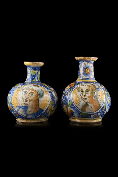 Manifattura di Venezia, fine secolo XVI. Bottega di Mastro Domenico. Due bottiglie in maiolica policroma decorata a fiori e volute intervallate da medaglioni con profili (h. cm 22,5; h. cm 21) (difetti e restauri)