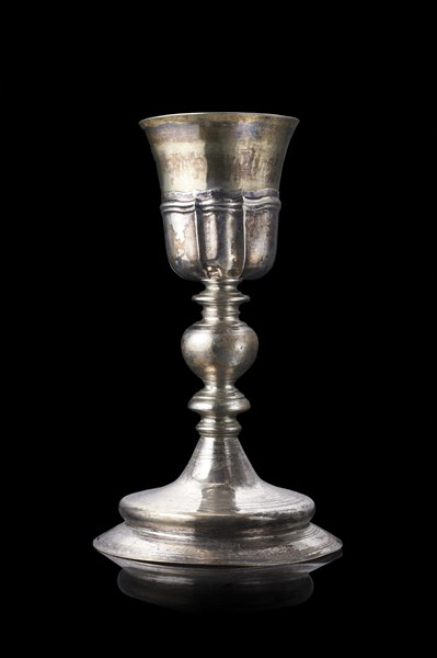 Calice in argento con fusto a rocchetto e base circolare incisa, coppa in verme