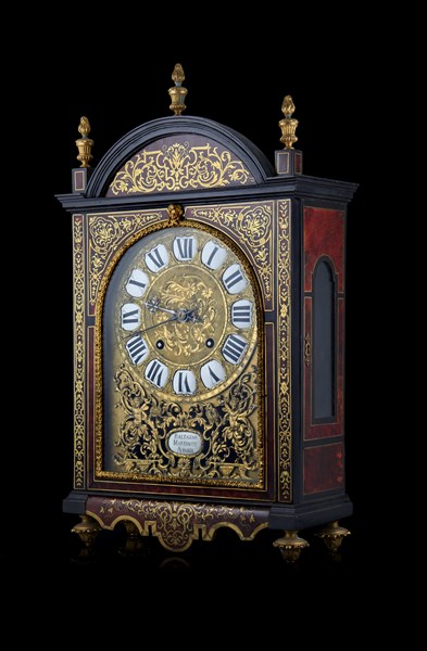 Pendola "religiosa" riccamente decorata ad intarsio del tipo "Boulle" con cassa in legno, ottone, tartaruga e bronzo dorato. Mostra composta nella parte superiore da un quadrante a cartouches smaltate a numeri romani e nella parte bassa da una decorazione in bronzo dorato al cui centro spicca il cartiglio con la firma del costruttore. Movimento a due treni con suoneria delle ore e mezze su campana con sistema a ruota partiore. Parigi, seconda metà del secolo XVII (cm 33,5x57,5x14,5) (lievi difetti)
