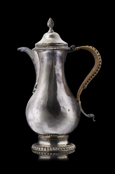 Caffettiera in argento con bordi cordonati e stemma nobiliare inciso. Presa del coperchio a pigna. Ansa a voluta fogliata rivestita in vimini. Iscritto DARE alla base. Punzoni di Londra, 1759. Argentiere non identificato (h. cm 28) (g 900) (difetti)