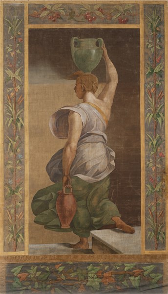 Arazzo realizzato con la tecnica "succo d'erba" su tela di cotone cannettillè raffigurante acquaiola con anfore e veli in policromia. Il motivo è un dettaglio di un dipinto antico di dimensioni maggiori, incorniciato da motivi vegetali. Toscana, prima metà del secolo XX (cm 260x146) (difetti e restauri)