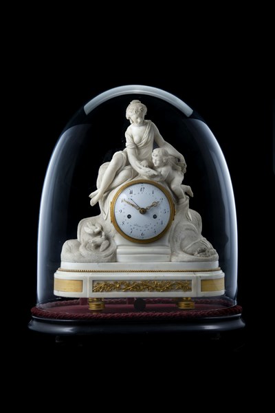 Pendola in marmo bianco a soggetto mitologico con guarnizioni in bronzo dorato. Quadrante in smalto bianco a cifre arabe con indicazione del calendario mensile. Movimento a due treni con suoneria delle ore e mezze su campanello. Francia, 1780 circa (cm 38x47x15 ca.) (difetti) Entro campana di vetro non originale