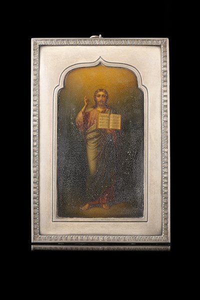 Arte russa dell'inizio del secolo XX. Icona raffigurante Cristo benedicente, olio su rame, dentro cornice in argento con bordo decorato a palmette e perlinature. San Pietroburgo. Argentiere Vladimirov (cm 15x23) (difetti e mancanze)