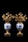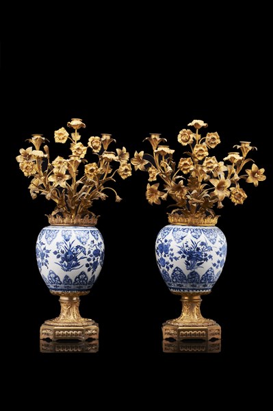 Manifattura del secolo XIX. Coppia di candelieri a sei fiamme con corpi in porcellana decorata nei toni del blu a motivi floreali. Porta candele e basi in bronzo cesellate e decorate a rilievo a tutto tondo a fiori e foglie (h. cm 68) (lievi difetti)
