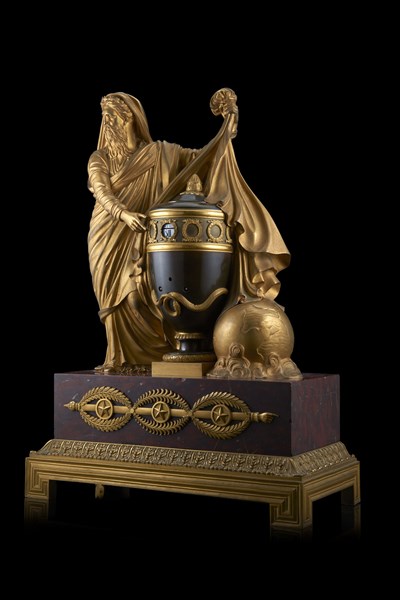 Pendola a ''cercles tournants'' a soggetto allegorico in bronzo dorato e patinato su base in marmo rosso. Movimento a due treni con suoneria delle ore e mezze su campanello. Movimento marchiato "Pons" con quadrante ad anelli girevoli a numeri romani per le ore e arabi per i minuti. Avanzamento a scatto per le ore e scappamento "Brocot". Francia, seconda metà del secolo XIX (cm 47x63x22) (difetti e mancanze)