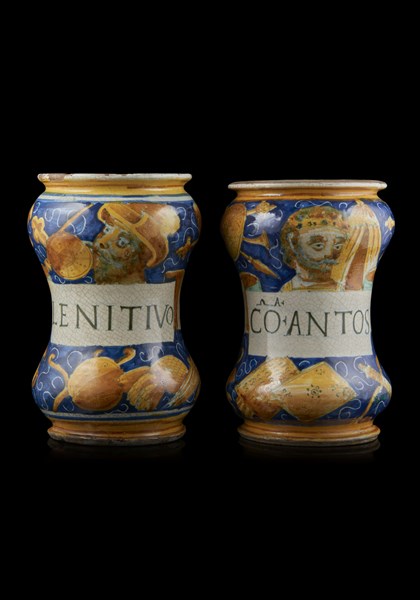 Manifattura di Castel Durante, fine secolo XVI. Due albarelli in maiolica polic