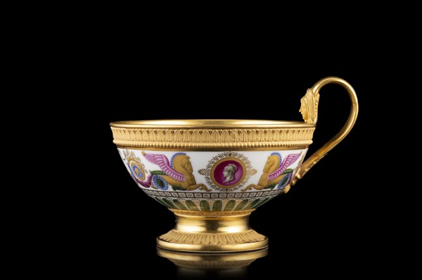 Manifattura di Nast, Parigi, inizio secolo XIX. Tazza in porcellana con profili dorati decorati in policromia a cavalli alati e medaglioni con profili in grisaille. Fascia in rilievo con perlinature e palmette. Ansa decorata all'attacco da mascherone classico e foglie d'acanto (h. cm 8; d. cm 12) (lievi difetti)